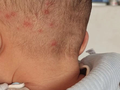亚急性湿疹患者枕部头皮上长出很多大小不一,边界不清的红斑,红斑有相互融合的趋势,病损不影响患儿头发生长,但是会感觉到瘙痒明显。