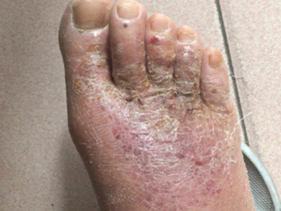 亚急性湿疹患者左脚大脚趾皮肤增厚,增厚处为浅褐色,表面有明显的角化,摸起来粗糙,左侧皮损表面有不规则的创口,创口可见其暗红色皮肤组织,边缘有少量液体渗出。