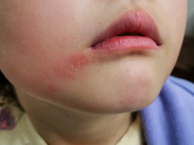 亚急性湿疹见于儿童,皮肤科检查发现患儿的右侧口角外侧缘有一片红斑,颜色鲜红,呈不规则形,边缘不整齐,但界限清楚。其上附着少量鳞屑,触之粗糙,且皮损表面干燥、瘙痒。