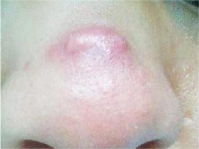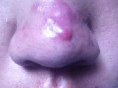 高雄性激素性痤疮见鼻部皮肤微微发红,但无肿痛,其上有一个隆起性损害,高出皮面约3mm,呈条索状横跨在鼻子上方,囊性,表面色红,为炎症性丘疹发展而来,表现为红色结节,局部皮损无破溃及流脓。