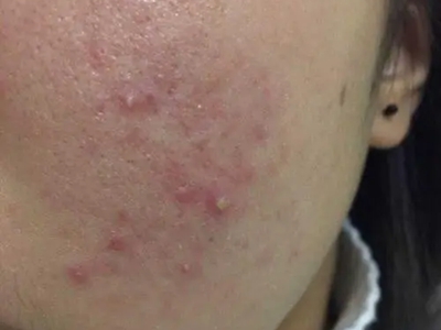 高雄性激素性痤疮皮肤出现弥漫性红色小丘疹,多为炎症性丘疹,数目众多,但多不融合。损害大小不等,小如绿豆,大如黄豆,部分表面紧张发亮,多不破溃。