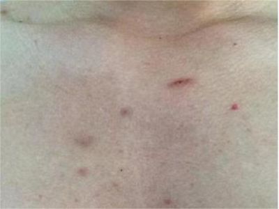 高雄性激素性痤疮皮损为炎症丘疹,顶端呈尖形或圆形,密集分布于胸前,部分皮损已消退,留下褐色的色素沉着性斑块,边界尚清,患者自觉症状轻微。