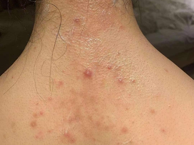 高雄性激素性痤疮损害呈弥漫性,见于患者的背部,为密集分布的红色丘疹,互不融合,大小不一,针尖至绿豆大。部分皮损因搔抓或摩擦而破溃渗血,干燥后结红色血痂。