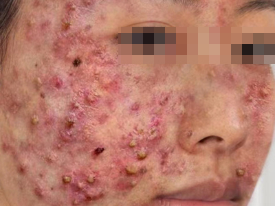 高雄性激素性痤疮损害呈多样性,表现为面部弥漫性暗红色丘疹及瘢痕,表面凹凸不平,损害密集分布,但不融合,大小不等。其上伴有少量红色痂皮,为丘疹破溃渗血所致。