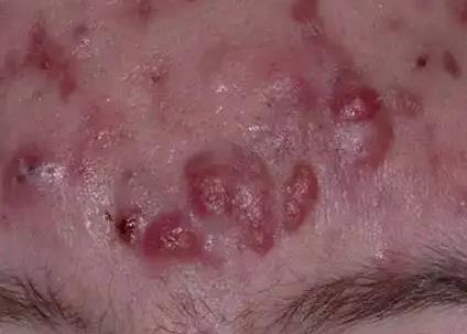 高雄性激素性痤疮表现为患者前额皮肤,在红斑的基础上出现暗红色结节,散在分布,绿豆至黄豆大小,周围绕以红晕,经抓挠后可破溃、渗液、流脓。