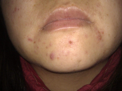 高雄性激素性痤疮损害见于下巴周围,为密集分布的红色隆起性损害,呈丘形,小者呈颗粒样外观,大者约绿豆大,部分顶端化脓有白色脓点。同时还伴有色素沉着。