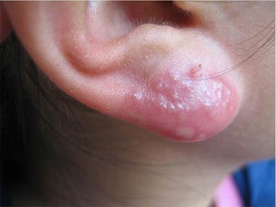 单纯疱疹发生于耳部,发作早期局部自觉灼热,出现红肿症状,然后在红斑基础上出现簇集状小丘疹和水疱,一段时间后破溃,内容物渗出、结痂。