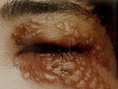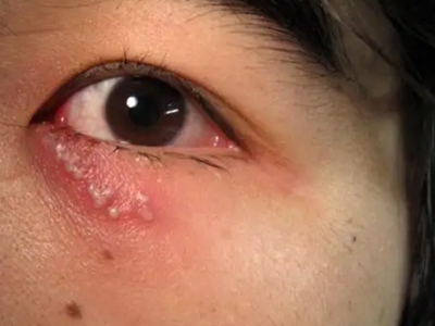 单纯疱疹常见于患者下眼睑,表现为皮肤发红、肿胀,其上有许多水疱,簇集状分布,部分融合成团,疱液浑浊而呈白色,自觉疼痛。