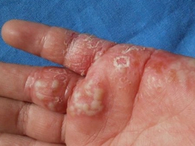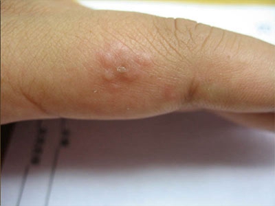 单纯疱疹发生于手指,特征为皮肤、黏膜成簇出现水疱、丘疹,粟粒至绿豆大小,一段时间后水疱破溃,出现浅表糜烂、渗出,易复发。