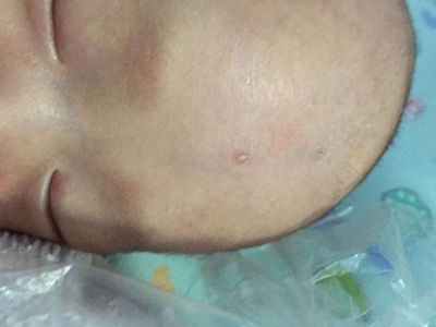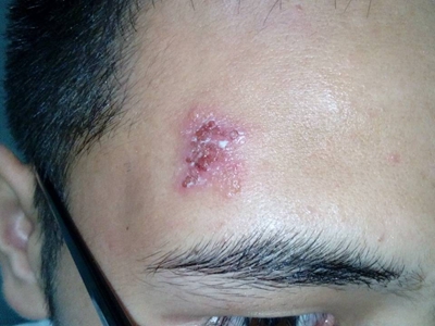 单纯疱疹发生于额头,损害为单个圆形的水疱,约为黄豆大小,半球形隆起,疱壁完整而薄,疱液呈透明状,周围无红晕、痂皮等损害。