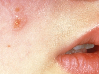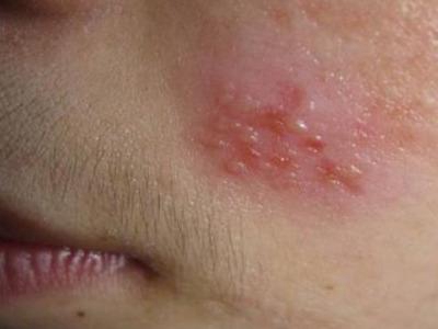 单纯疱疹发生于面部,表现为发生迅速的簇集性水疱,针尖至绿豆大小,基底潮红,内有疱液,开始澄清,然后逐渐浑浊,破后渗液、结痂。
