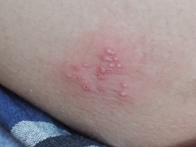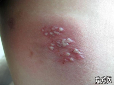单纯疱疹出现在大腿上,初期是几个小丘疹,随后迅速形成水疱,疱壁变为白色,水疱周围形成红斑,通常没有其他不适,水疱能够自行吸收。