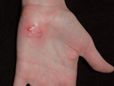单纯疱疹发生于手掌,初起患处灼热、潮红,然后在此基础上出现簇集性水疱,针头至绿豆大小。内容物初起清澈,然后化脓变浑浊,患者自觉瘙痒。