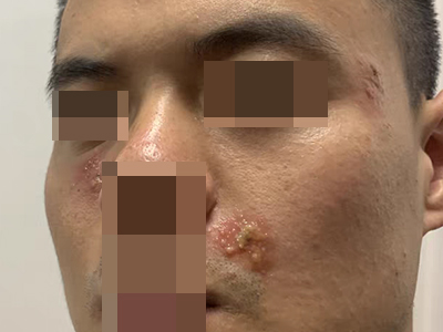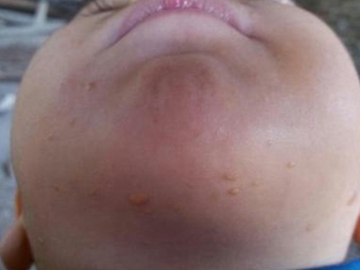 单纯疱疹发生于下巴时,会出现多个针尖至黄豆大小的黄色水疱,明显隆起于周围皮肤,散在分布,疱壁厚且疱液浑浊,自觉疼痛感明显。