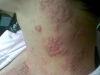 单纯疱疹表现为脖子上起了密密麻麻的水疱,针尖至黄豆大小,部分相互融合成片,周围有红晕,与周围皮肤境界清楚,常伴有疼痛和灼热感。