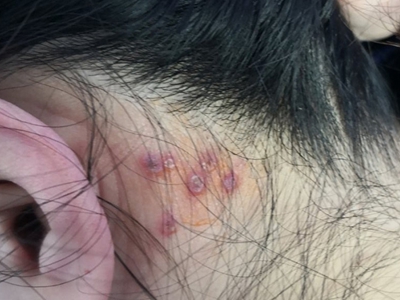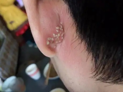 单纯疱疹耳朵后面有几个黄豆大小的水疱,呈紫红色,水疱中间凹陷面积较大,上带有结痂,水疱整体呈干瘪状,个别水疱破裂,黄色疱液流出。