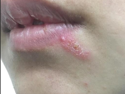 单纯疱疹发生于嘴唇,初起患处皮肤发红、灼热,并有疼痛,继而出现集簇分布的水疱,疱内开始清澈,然后变为脓疱,破后露出糜烂面,有脓水,干后结痂而愈。