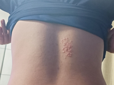 单纯疱疹患者后背皮肤局部出现较多水疱,多达数十个,水疱大小不等,密集分布,水疱壁紧致发亮,边界清楚,部分相互融合,部分独立存在,患者自觉疼痛、瘙痒。