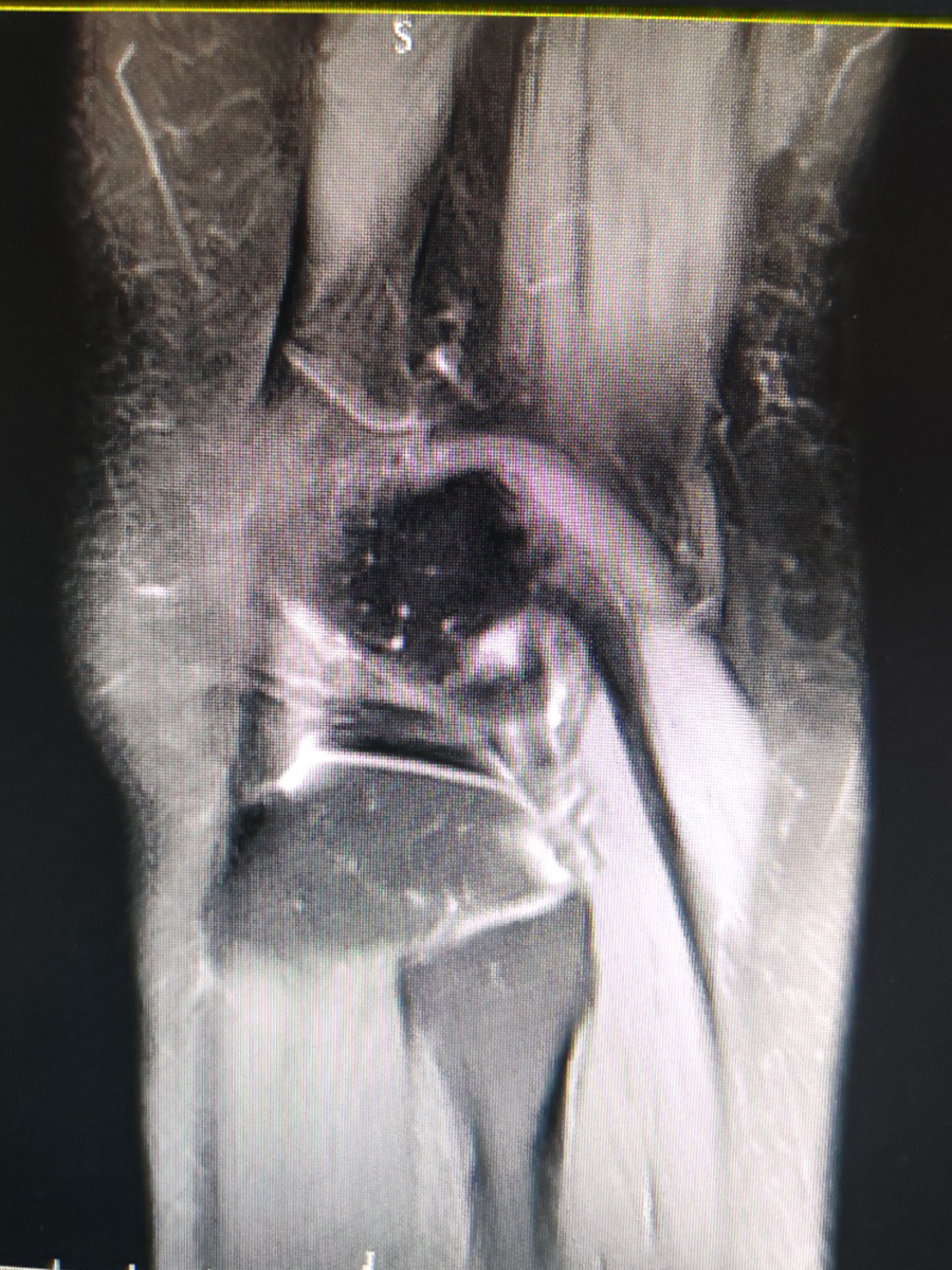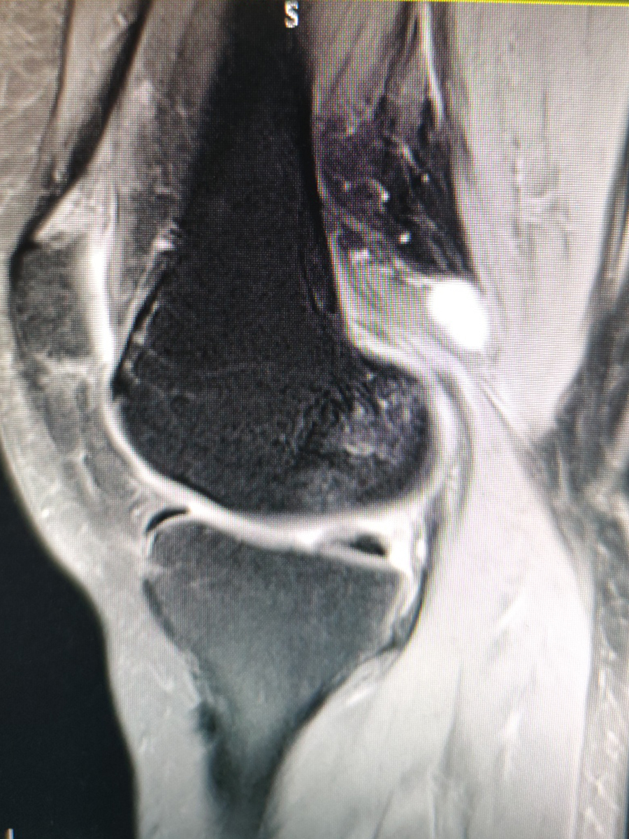 患者是一位中年女性,1个月前出现右膝疼痛,伴乏力,主要是下蹲起身时无力,疼痛以腘窝处为重,劳累后有加重迹象,休息后减轻,无肢体麻木。我给患者进行体格检查,发现右膝内侧压痛、肿胀,膝关节被动活动没有明显受限,承重屈膝60°受限,腘窝处可以触及肿块,大小1×2cm。嘱患者进行磁共振检查,提示关节积液和腘窝囊肿。综合其临床症状以及相关检查结构,以关节病收入我院,进行下一步治疗。