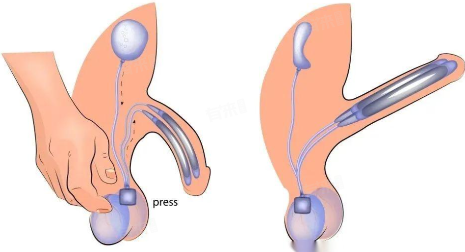 - 当患者有性需求时,通过挤压阴囊内的泵,将储液囊中的液体输送到阴茎海绵体内的圆柱体中,随着液体的填充,圆柱体膨胀,从而使阴茎勃起,性行为结束后,可操作泵使液体回流到储液囊,阴茎恢复疲软状态。