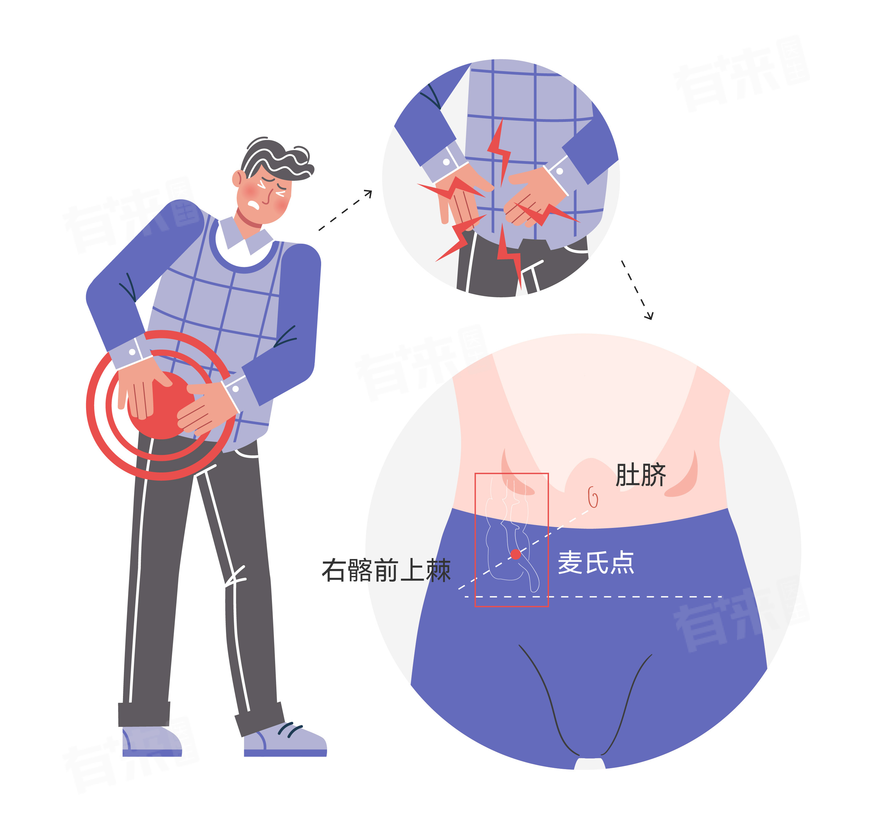 - 但是随着炎症的逐渐加重和扩散,阑尾周围的腹膜受到刺激,疼痛开始发生明显的转移和定位。疼痛会逐渐从上腹部或脐周转移至右下腹的麦氏点,即右髂前上棘与脐连线的中外1/3交界处。这个位置的疼痛通常较为固定,且呈持续性钝痛或胀痛,有时还可能伴有阵发性的加剧。