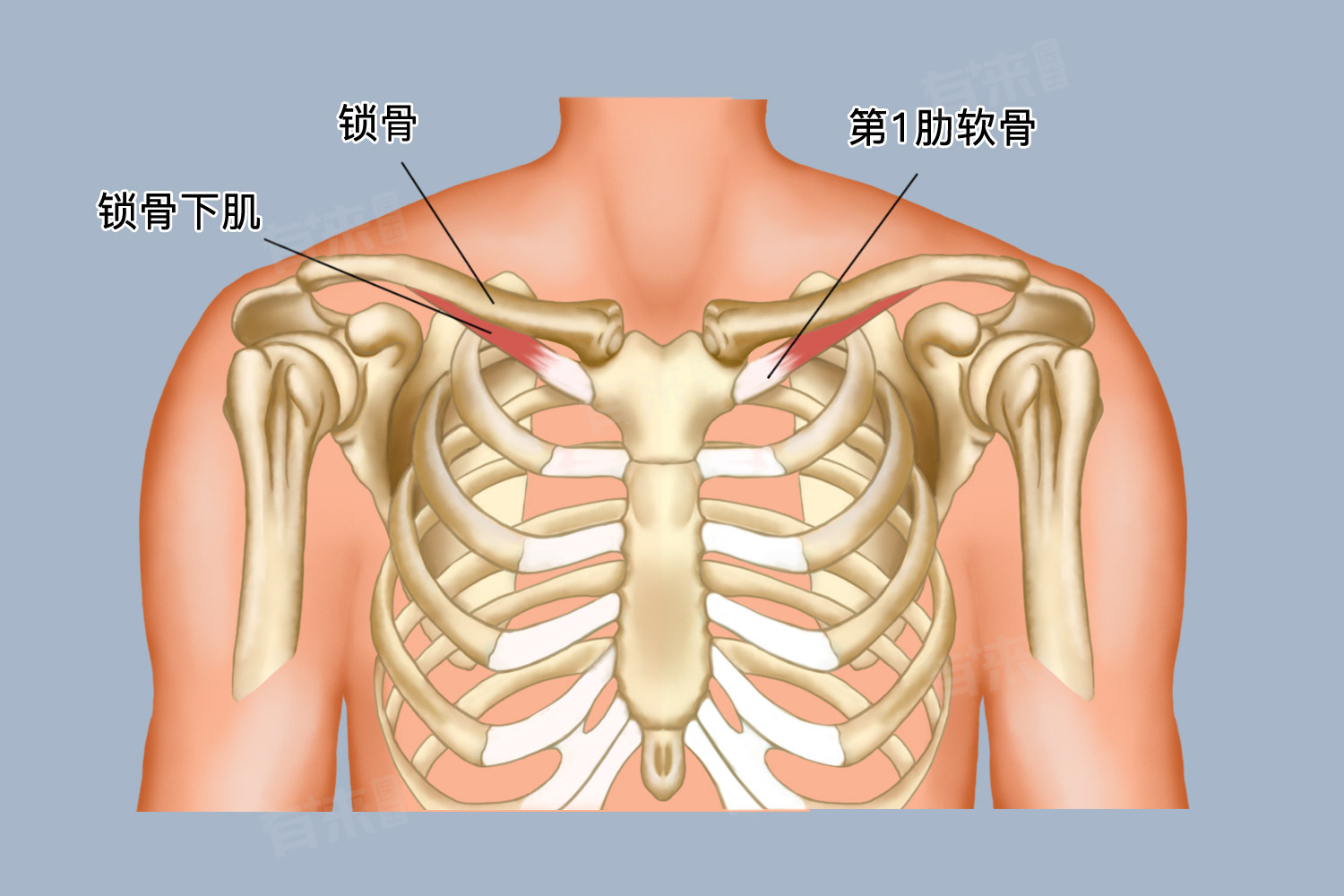 - 锁骨是上肢与躯干的连接桥梁,其位置与胸椎的对应关系使得上肢的重量得以有效传导至躯干,从而维持身体的平衡与稳定。锁骨作为坚硬的实性骨性结构,可以保护后方的血管、神经等重要组织,以及胸腔及胸腔内的器官,其位置与胸椎的对应关系,进一步增强了这一保护功能的有效性。