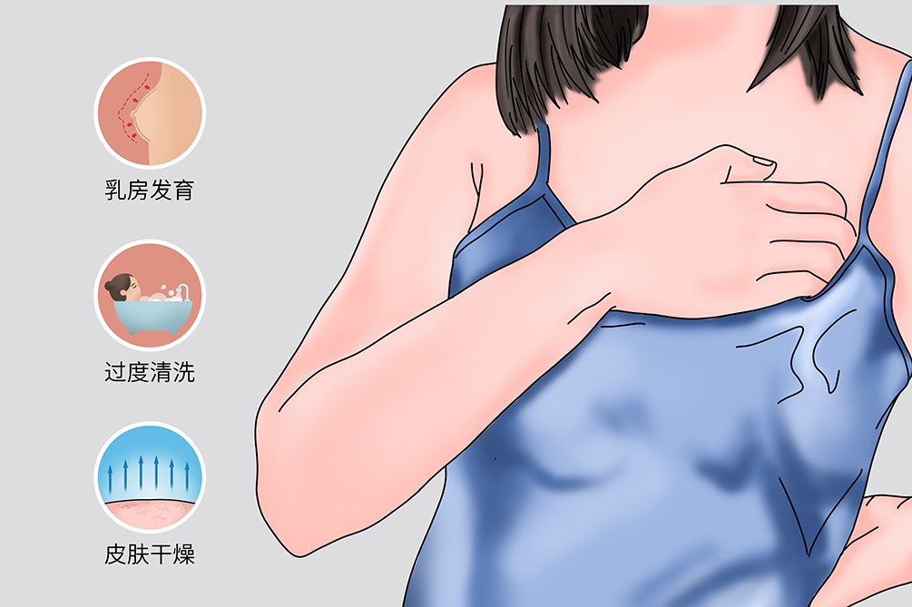 - 青春期发育:青春期女性乳房快速发育,乳头产生分泌物,如果没有做好清洁工作,容易导致细菌滋生,出现乳头瘙痒的情况。也可能是青春期激素分泌增多导致乳房皮肤瘙痒。