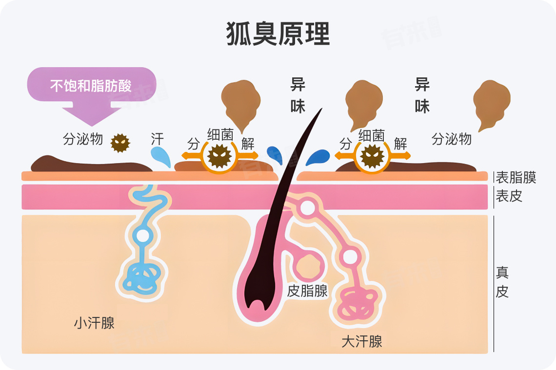 - 狐臭的根源在于大汗腺。大汗腺分布在腋窝、乳晕、肛周等区域,其分泌物富含蛋白质、脂质等物质。腋窝温暖潮湿,利于细菌滋生,细菌分解大汗腺分泌物中的成分,产生不饱和脂肪酸和氨,从而散发刺鼻气味,形成狐臭。而脱毛膏的作用机制与大汗腺功能毫无关联,无法改变大汗腺的分泌特性。
