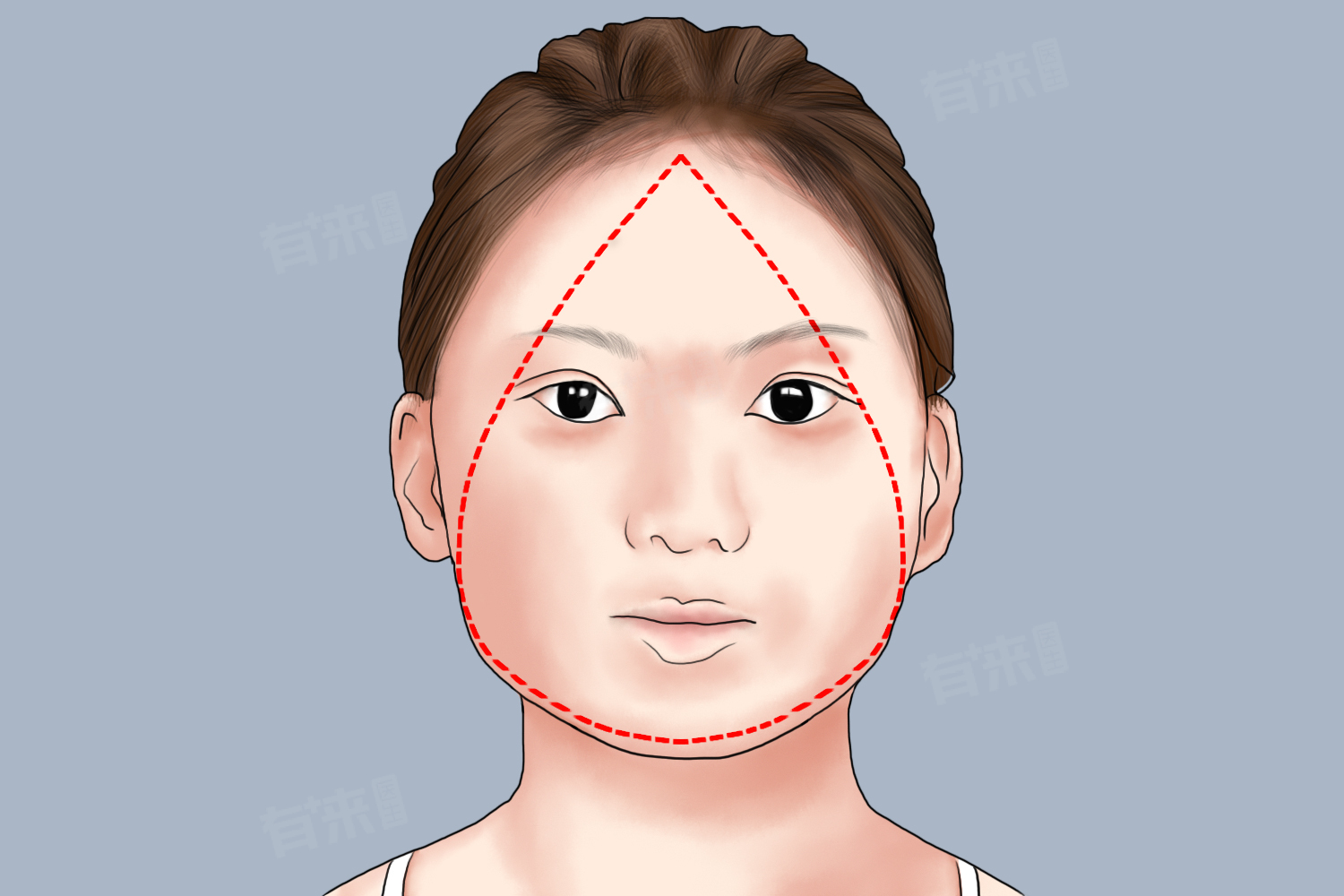 2、椭圆形脸型:额部稍宽而圆,颧颊部丰满,下巴稍窄并圆,比例协调,面部轮廓不明显。这种脸型被认为是非常理想和和谐的脸型,给人一种温婉、优雅的感觉。