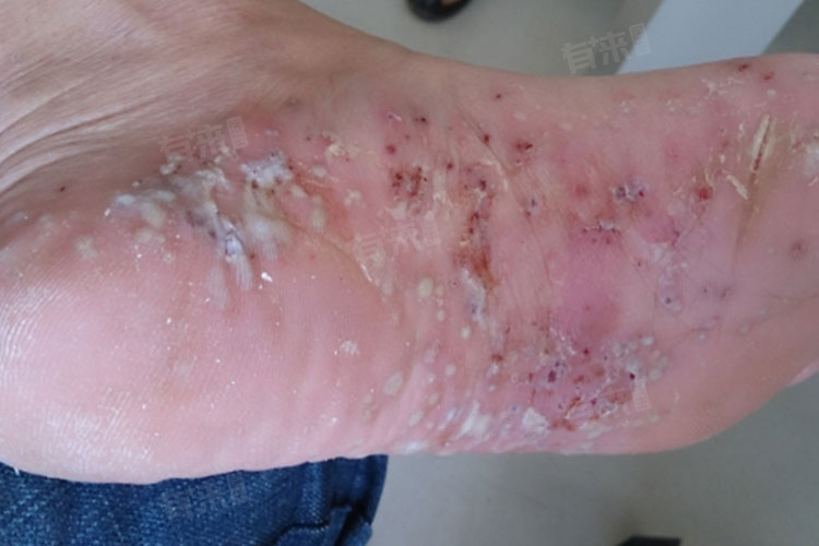 4、汗疱疹:由局部过敏、皮肤癣菌感染等因素导致脚底出现小水疱,伴有剧烈瘙痒。在水疱吸收或破溃后,可能导致局部出现脱皮和干裂。保持脚部清洁干燥,避免穿材质较差的鞋袜,可遵医嘱使用抗组胺药物、糖皮质激素药膏等药物进行治疗。