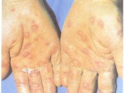 2、病毒感染:单纯疱疹病毒是最常见的致病因素之一,尤其是HSV-1型。研究表明,约50%以上的复发性多形红斑与单纯疱疹病毒感染有关。此外,EB病毒、柯萨奇病毒、流感病毒等感染也可能诱发多形红斑。
