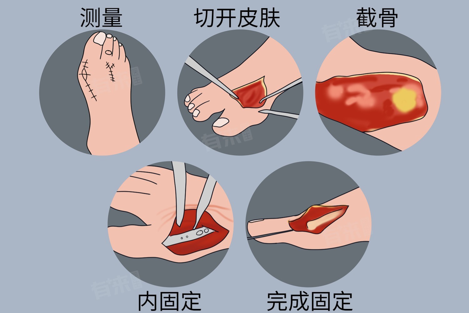 - 截骨术:对于较为严重的拇外翻,常用的截骨方式包括V形截骨术和Chevron截骨术。手术时,医生会在第一跖骨处进行截骨,并通过特定的角度和位置重新固定,以矫正畸形并恢复足部的正常功能。