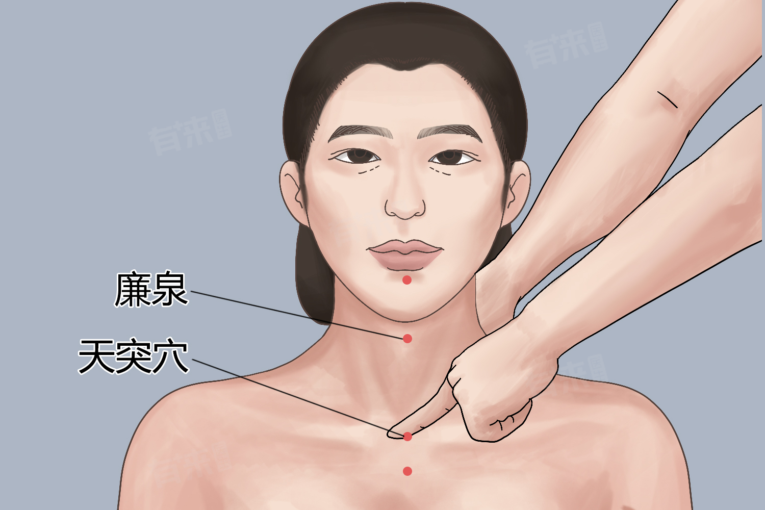 5、保健方法:按摩法:取坐位或仰卧位,以拇指指腹着力于天突穴,向胸骨柄方向,缓慢均匀的按压,按后可施以揉法,按一揉三,使局部产生酸麻、胀痛感觉,再缓缓放松,反复操作3-5遍。注意不可往气管方向用力。在按摩此穴时,可以一边按摩,一边做吞咽的动作,配合呼吸,将唾液吞咽下去,有助于减轻按摩带来的不适感。热敷法:热敷天突穴也是一个极好的刺激办法,尤其适合对艾灸刺激敏感或感觉艾灸过于强烈的人群。