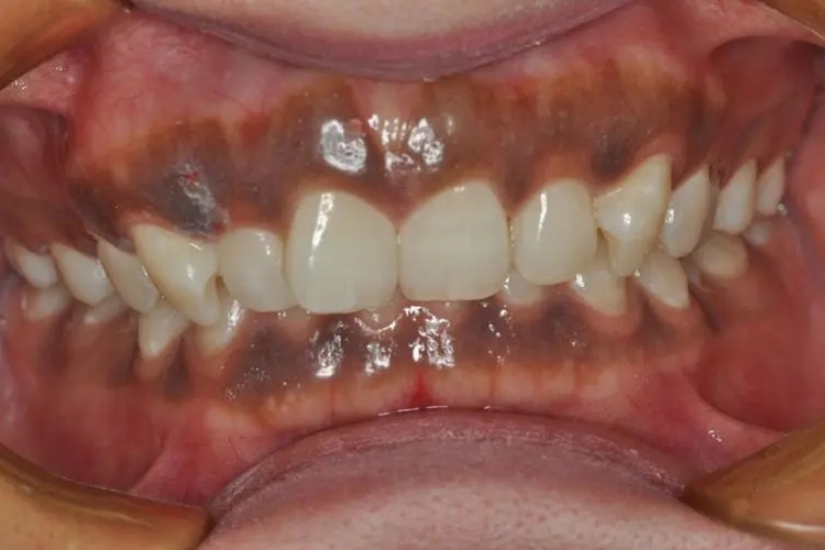 2、吸烟:长期吸烟是导致牙龈发黑的常见原因之一,香烟中的尼古丁、焦油等有害物质会在牙龈上沉积,导致牙龈颜色变暗,甚至出现黑斑。