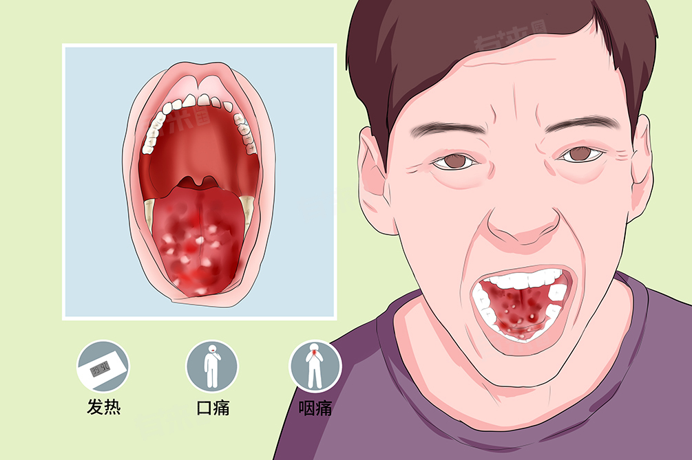 2、症状表现:口腔黏膜充血,局部形成糜烂或溃疡。在溃疡或糜烂的表面覆盖着一层灰白色或黄褐色假膜,假膜特点是较厚而微突出黏膜表面,致密而光滑。擦去假膜后,可见溢血的糜烂面,周围黏膜充血水肿。患者可能伴有唾液增多、疼痛明显、炎性口臭以及区域淋巴结肿大压痛等症状。