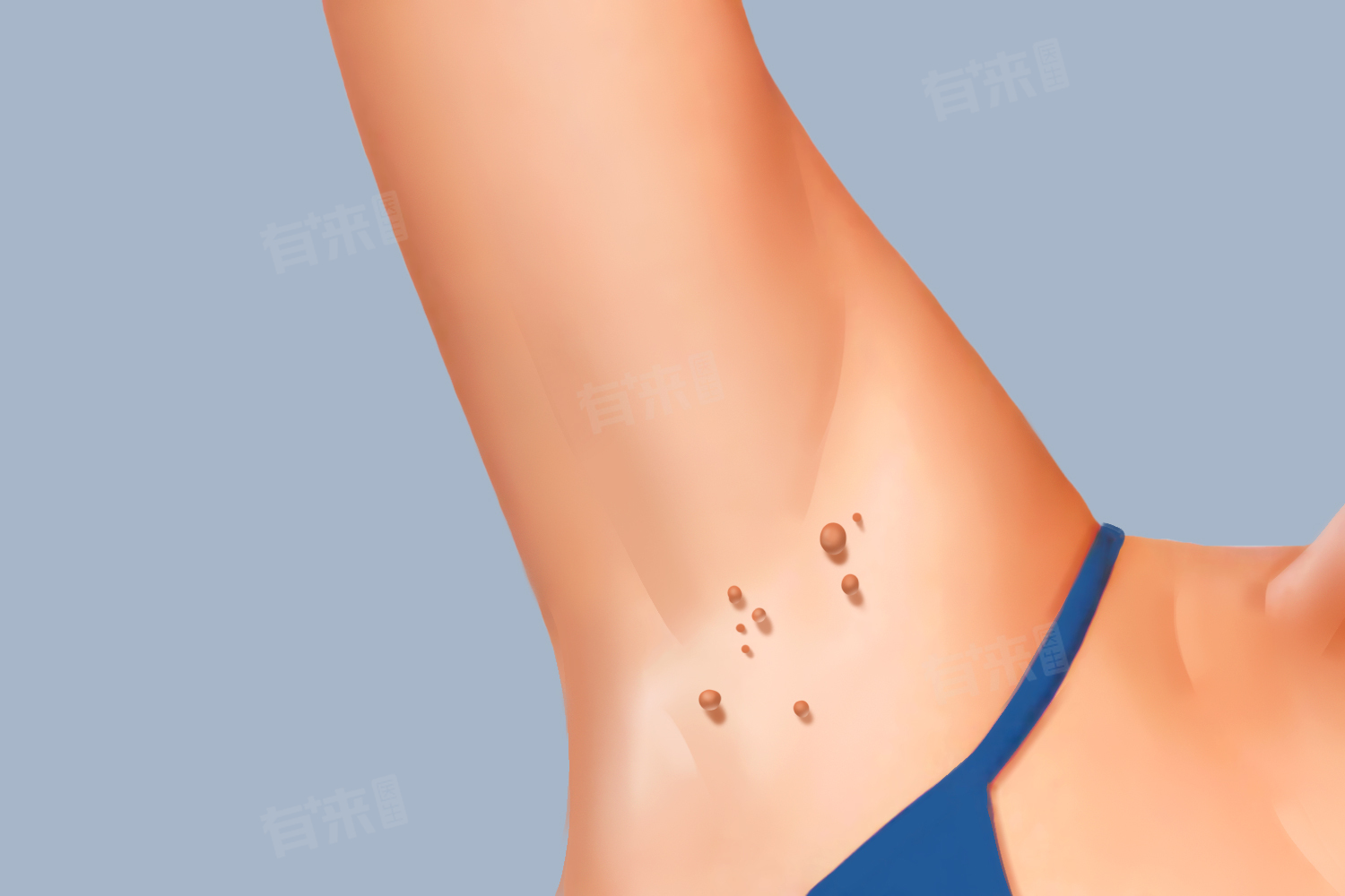 - 皮脂腺囊肿:腋下皮脂腺丰富,当皮脂腺导管堵塞时,皮脂积聚形成囊肿,表现为皮下疙瘩,囊肿一般呈圆形,质地较软,可推动,有时表面可见黑头。若发生感染,可出现红肿、疼痛。