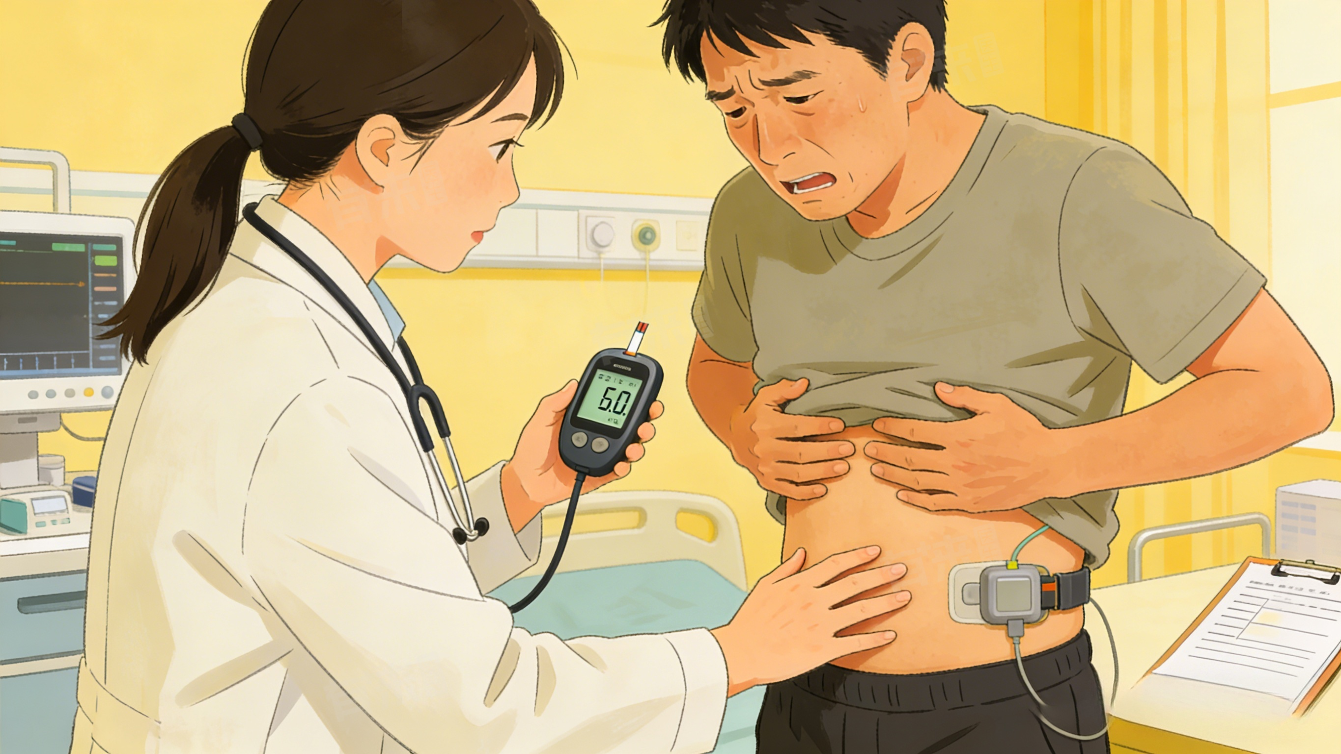 - 监测血糖与症状:立即监测空腹及餐后血糖,观察血糖是否存在骤升、骤降或过高的情况,同时记录腹痛的部位、性质、持续时间及伴随症状,如是否有恶心、呕吐、呼吸异常等,为后续就医提供准确依据,避免盲目处理。