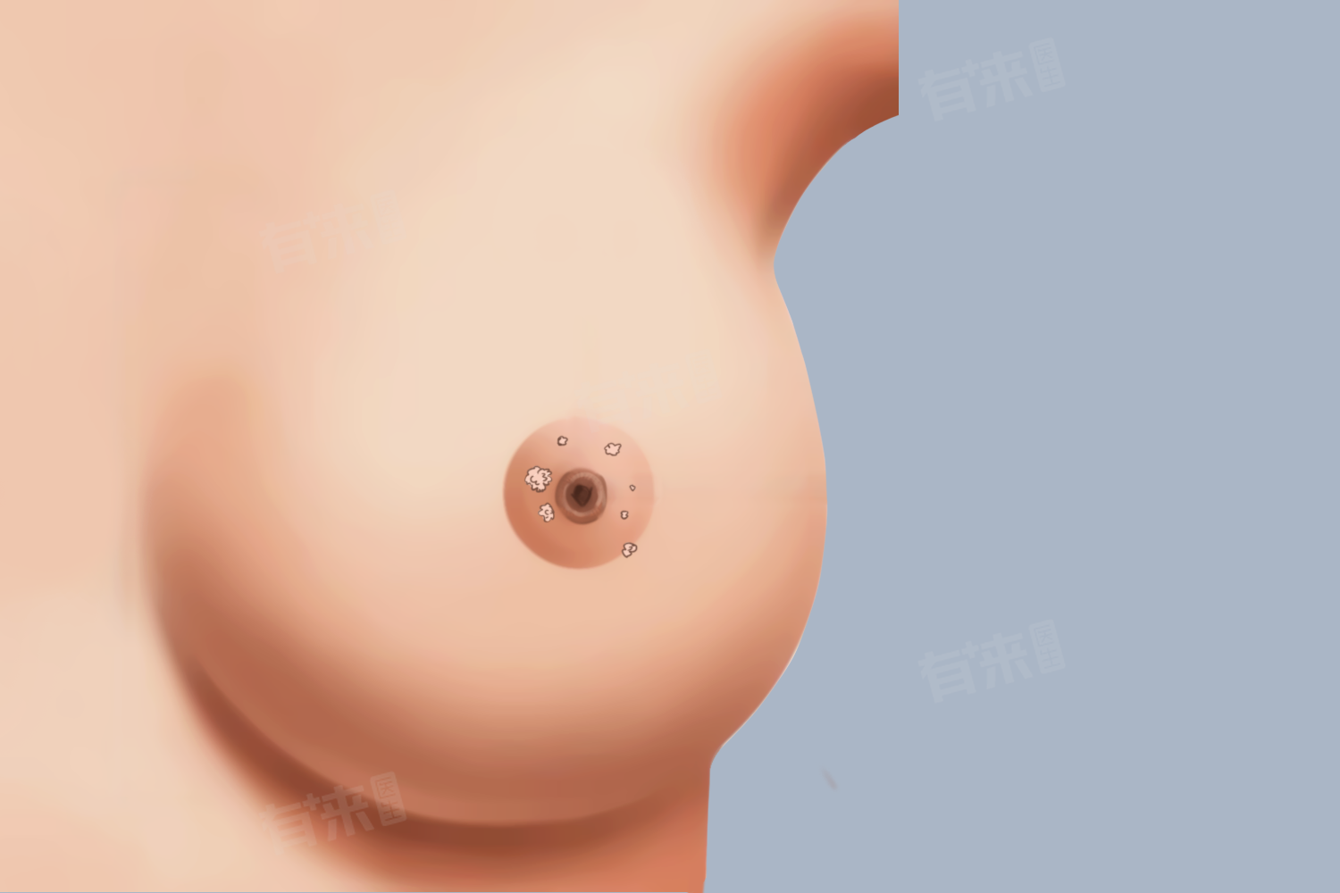 2、乳头尖锐湿疣:乳头尖锐湿疣是由人乳头瘤病毒感染引起,多因性接触传播,病毒感染乳头皮肤黏膜后,致使乳头局部组织增生,形成菜花状疣体。患者一般无明显疼痛,但疣体可逐渐增多、增大。