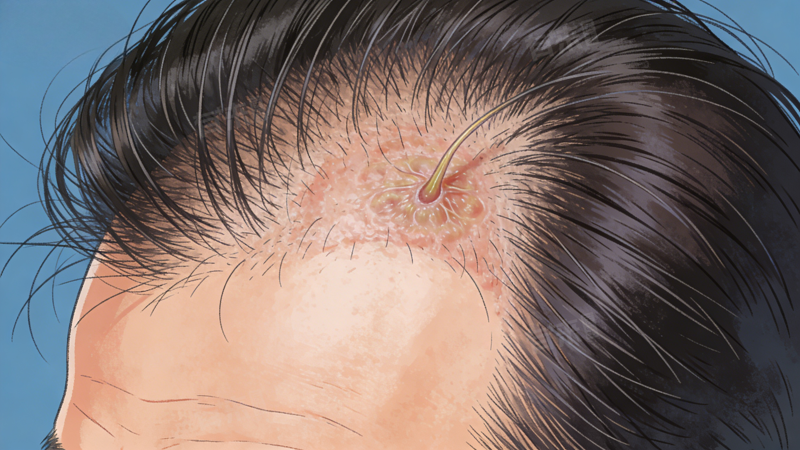 5、局部毛囊损伤:长期牵拉额角毛发、频繁染烫、使用刺激性洗护用品,会损伤额角毛囊和毛鳞片,导致毛囊功能受损,引发脱发。局部皮肤炎症未及时治疗,也会破坏毛囊,导致额角毛发脱落。