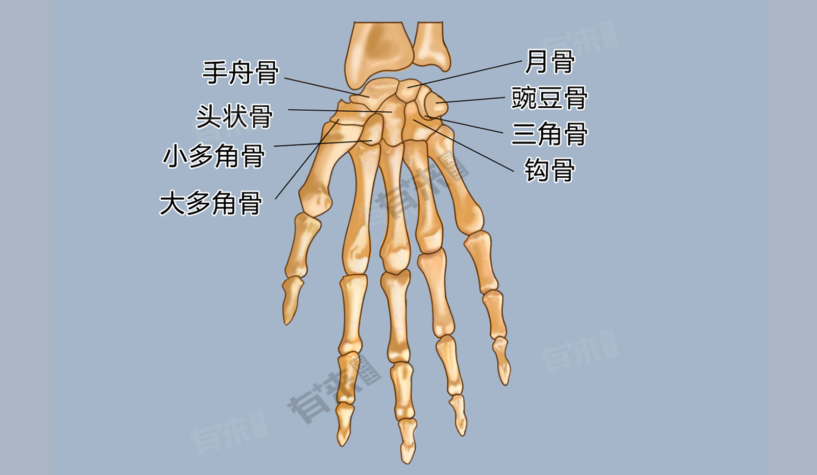 - 腕部的短骨,通常被称为腕骨,由八块骨头组成,分为两排,每排四块。近侧一排从拇指一侧开始依次为舟状骨、月状骨、三角骨和豌豆骨;远侧一排则包括大多角骨、小多角骨、头状骨和钩骨,这些骨头紧密排列在一起,形成了一个相对灵活但又坚固的结构,既支持了手部精细的动作需求,也提供了必要的支撑力以应对日常活动中对手腕施加的各种压力。