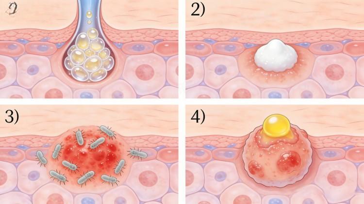 1、毛囊皮脂腺导管角化异常:毛囊皮脂腺导管因激素波动出现角化异常,导管内壁增厚、管腔变窄,导致导管堵塞,这是痘痘形成的初始阶段。此时无明显外部症状,仅毛囊内部出现导管狭窄,若持续发展,会为后续油脂堆积、细菌滋生创造条件,无需用药,注意皮肤清洁即可。