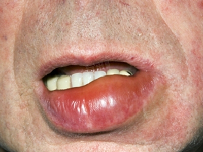 - 巨大荨麻疹导致的嘴唇肿胀,通常表现为唇部突然出现的局限性水肿,形状不规则,可能伴有轻微的疼痛或灼热感。