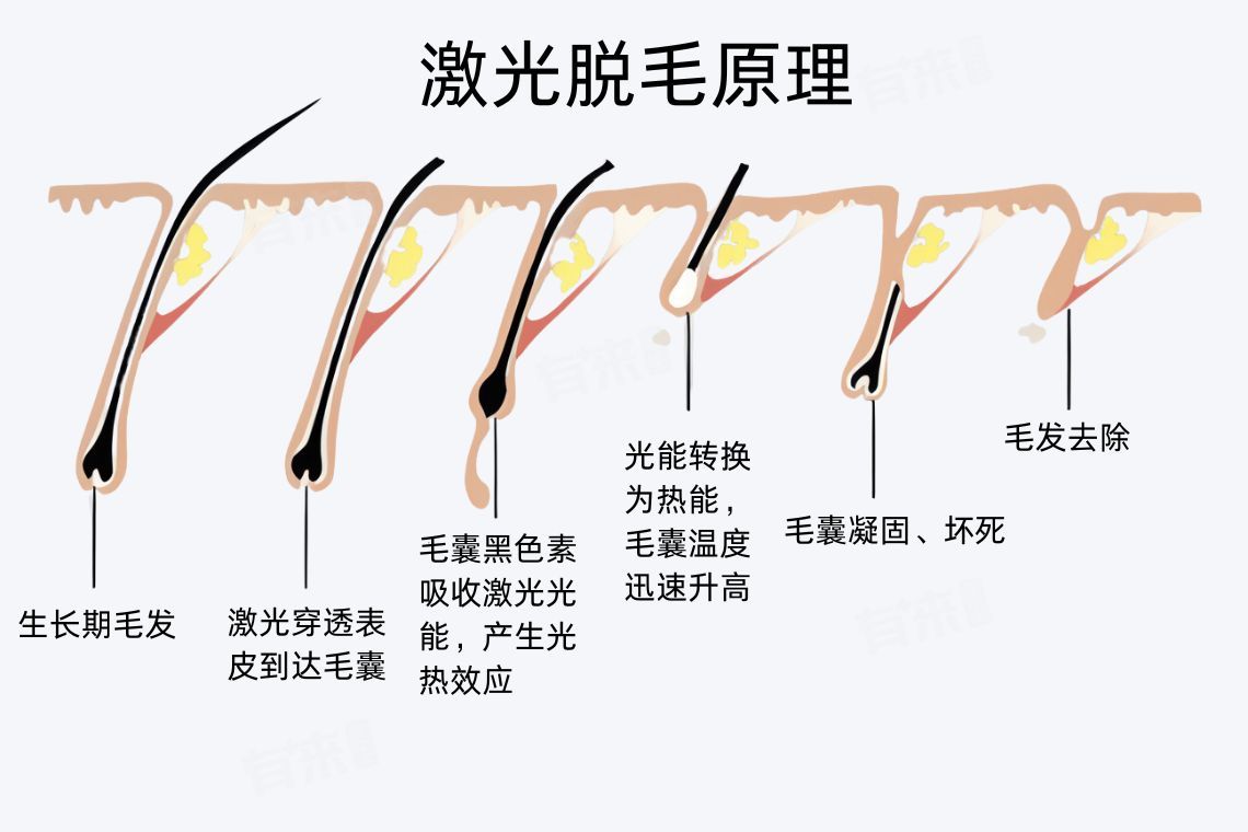 4、激光脱毛:毛囊中的黑色素能够吸收特定波长的激光能量,产生的热效应会破坏毛囊,从而达到抑制毛发生长的目的,一般需要进行多次治疗,因为毛发有不同的生长周期,只有处于生长期的毛囊对激光比较敏感。通常间隔1-3个月进行一次治疗,经过多次治疗后,可以使毛囊逐渐失去再生毛发的能力,不过激光脱毛可能会有一些副作用,如皮肤红肿、疼痛等,且对于肤色较深或者毛发颜色较浅的人,效果可能会受到一定影响。