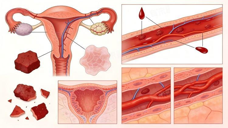 5、子宫内膜增生症:子宫内膜增生症由体内雌激素水平持续偏高、孕激素缺乏引发,子宫内膜异常增厚,脱落时出血量大幅增多,经血无法及时排出形成大量血块,可伴随月经周期紊乱、经期显著延长,属于内分泌紊乱引发的器质性病变。