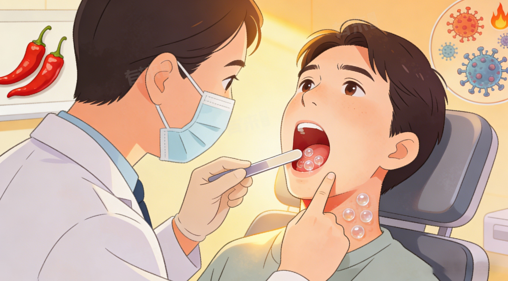 5、咽喉部疱疹性溃疡:病毒或细菌感染加重,导致咽喉部疱疹破裂后形成溃疡,伴随剧烈咽痛、吞咽困难、发热,严重时可能影响进食和正常说话,若感染扩散,还可能引发局部炎症加重,甚至出现并发症。