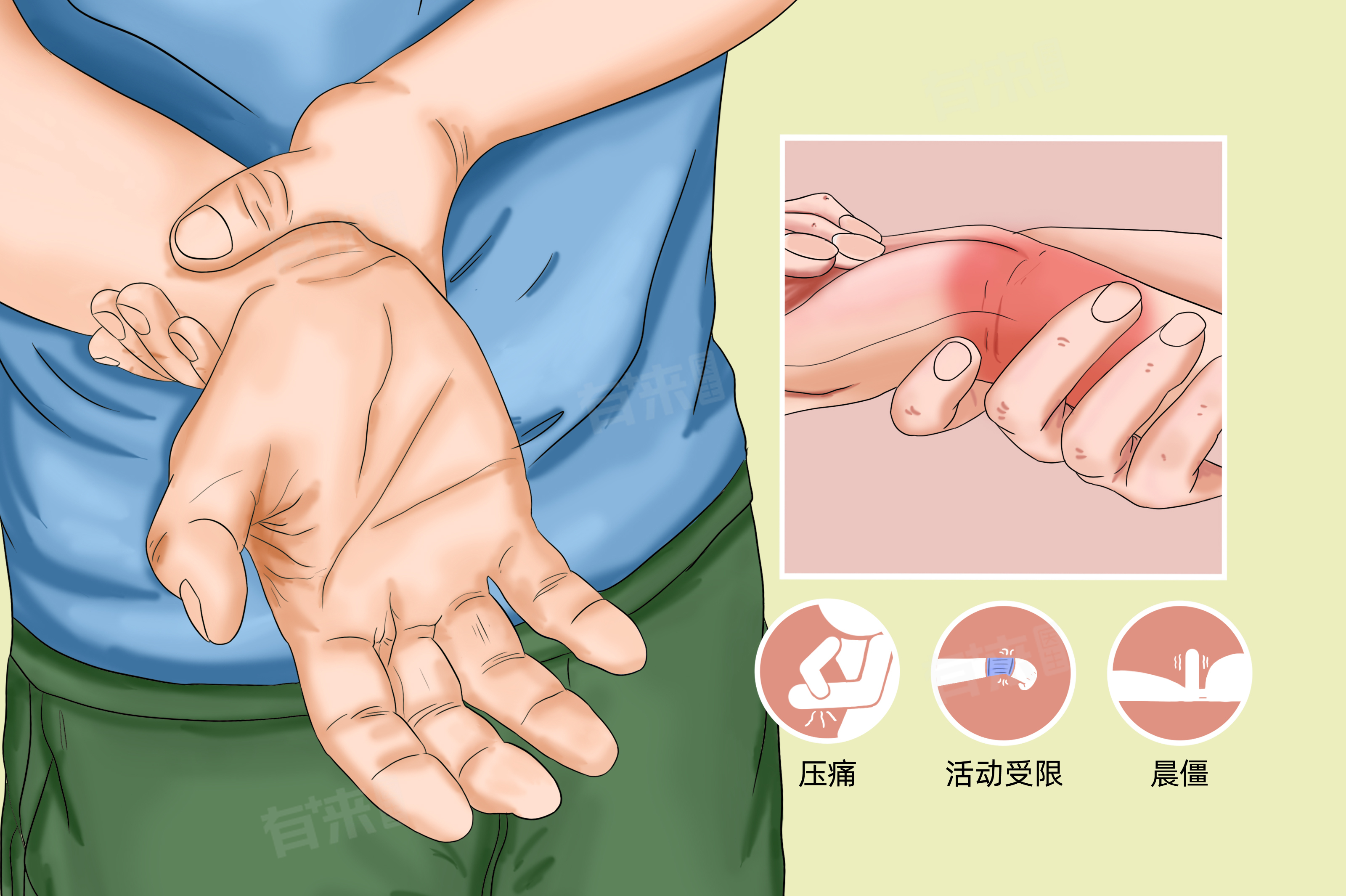 4、风湿性关节炎:风湿性关节炎累及手腕关节时,会出现疼痛、肿胀、僵硬等症状,疼痛在早晨或长时间休息后加重,活动后可稍有缓解,可能伴有其他关节的不适。