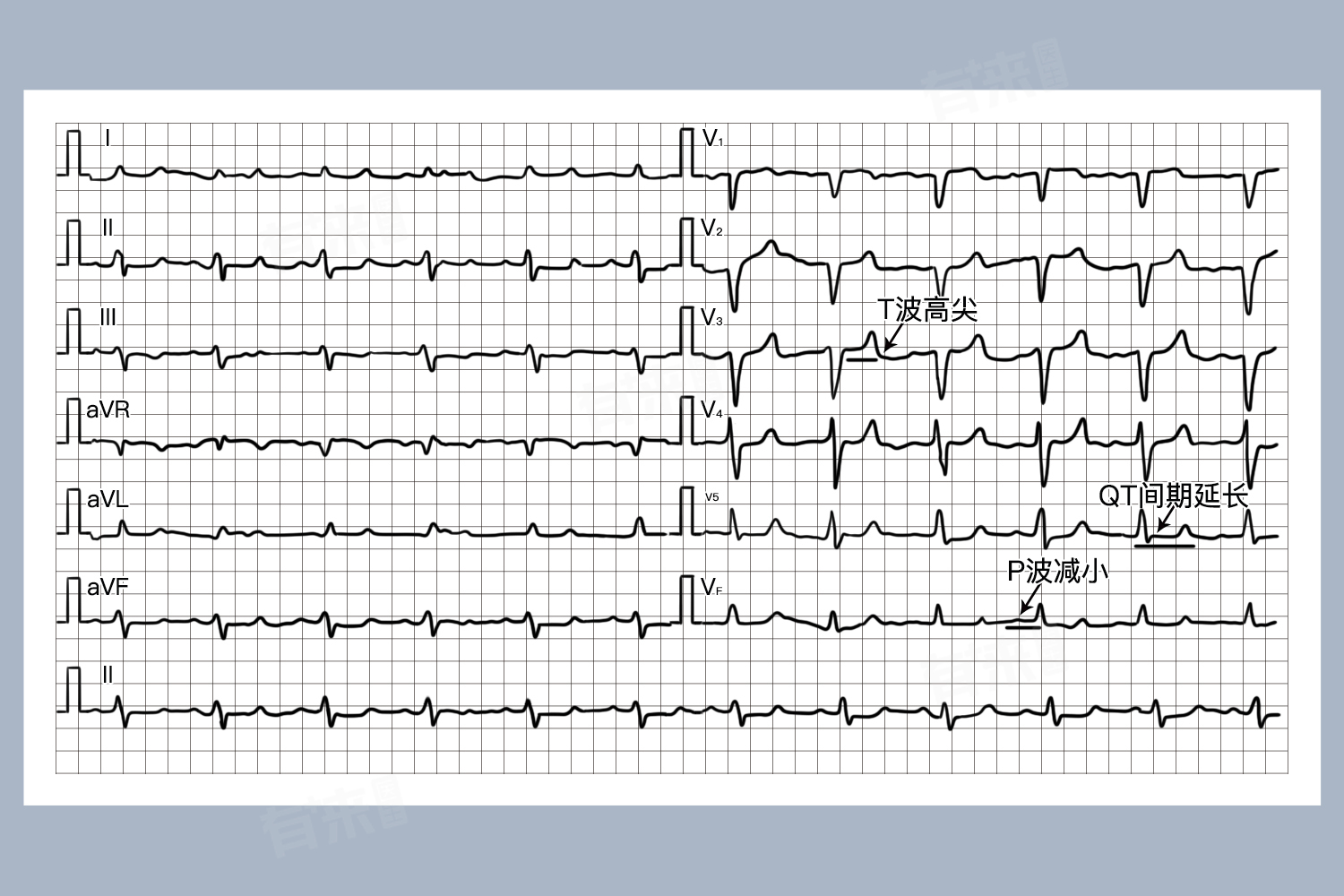 - 高钾血症:高钾血症是T波高尖最常见的原因之一。由于血钾浓度升高,导致心肌细胞复极过程异常,从而出现T波高尖。此时,患者可能伴有其他高钾血症的症状,如心律失常、四肢麻木等。