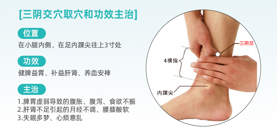 4、三阴交:位于内踝直上约3寸处,胫骨后缘。三阴交为足三阴经(足少阴肾经、足厥阴肝经、足太阴脾经)的交会穴,可健脾益气、益肾固本,对于漏尿症状有一定的缓解作用。