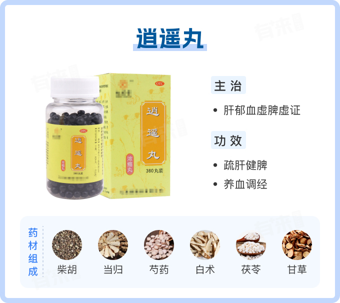 - 逍遥丸:主要由柴胡、当归、白芍、白术(炒)、茯苓、薄荷、生姜、甘草(炙)组成。是经典的方剂,以疏肝健脾为主要思路。