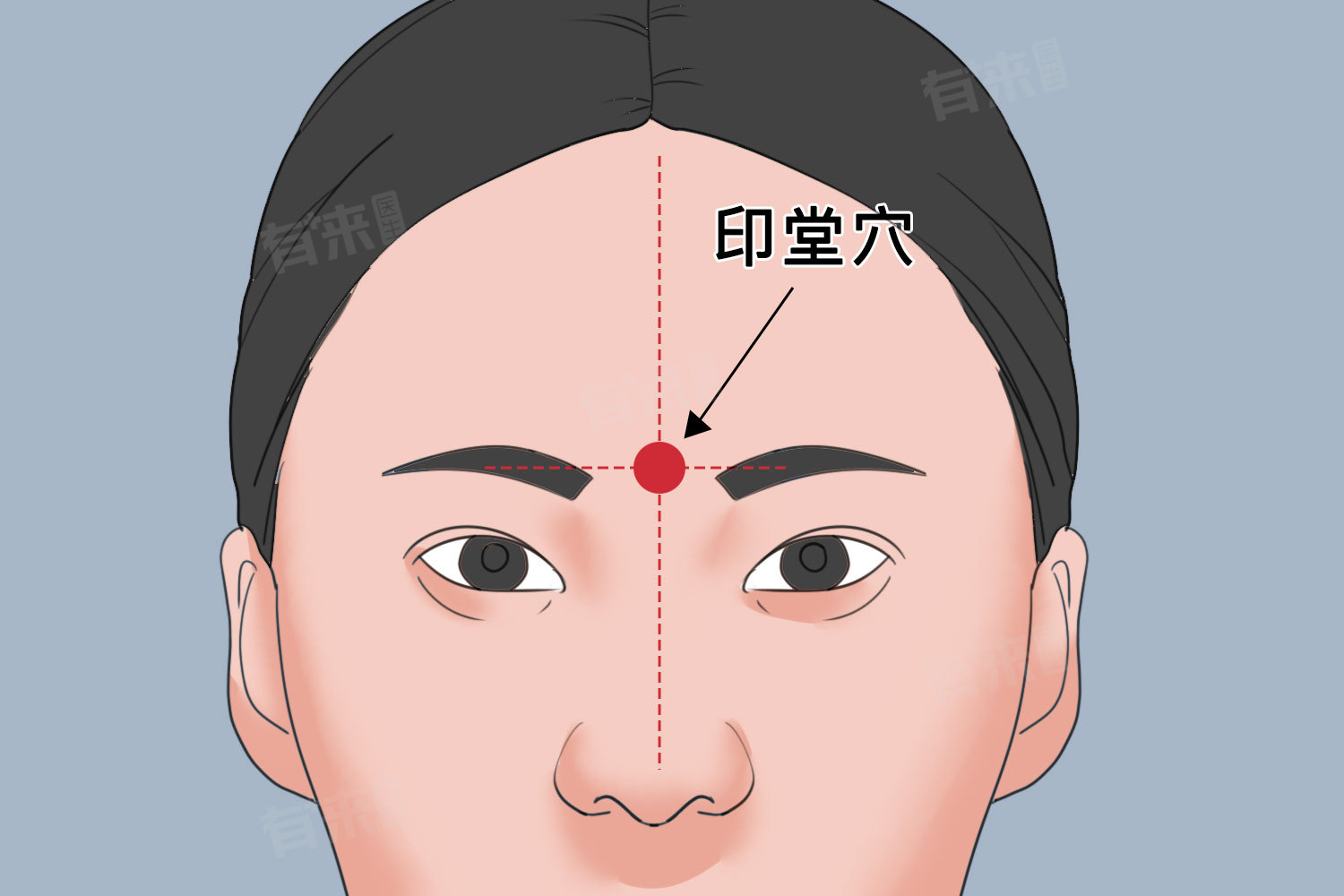 1、印堂穴:位于两眉头连线的中点,用拇指指腹轻轻按压并顺时针、逆时针轻轻按揉。此穴有助于促进血液循环,为大脑提供充足养分,促进生长发育。